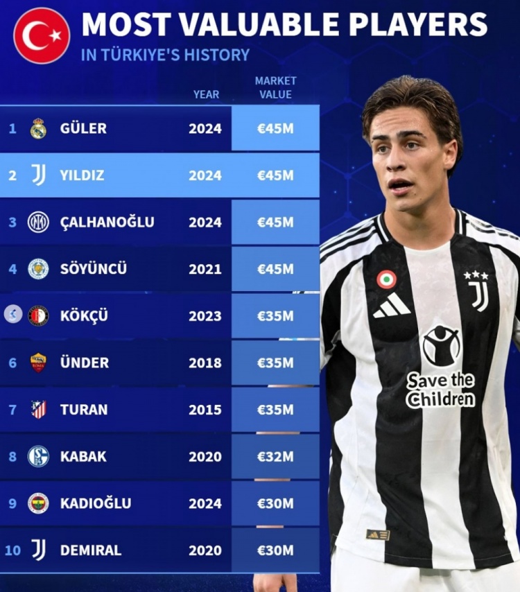 他也和另一位同为19岁的小将居勒尔当前身价均为4500万欧元,追平了土耳其球员的历史最高身价纪录。